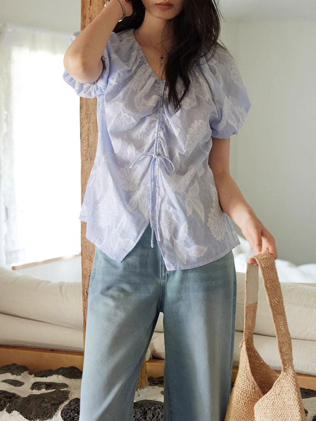 Katelyn Retro V-Neck Puff Sleeve Striped Top