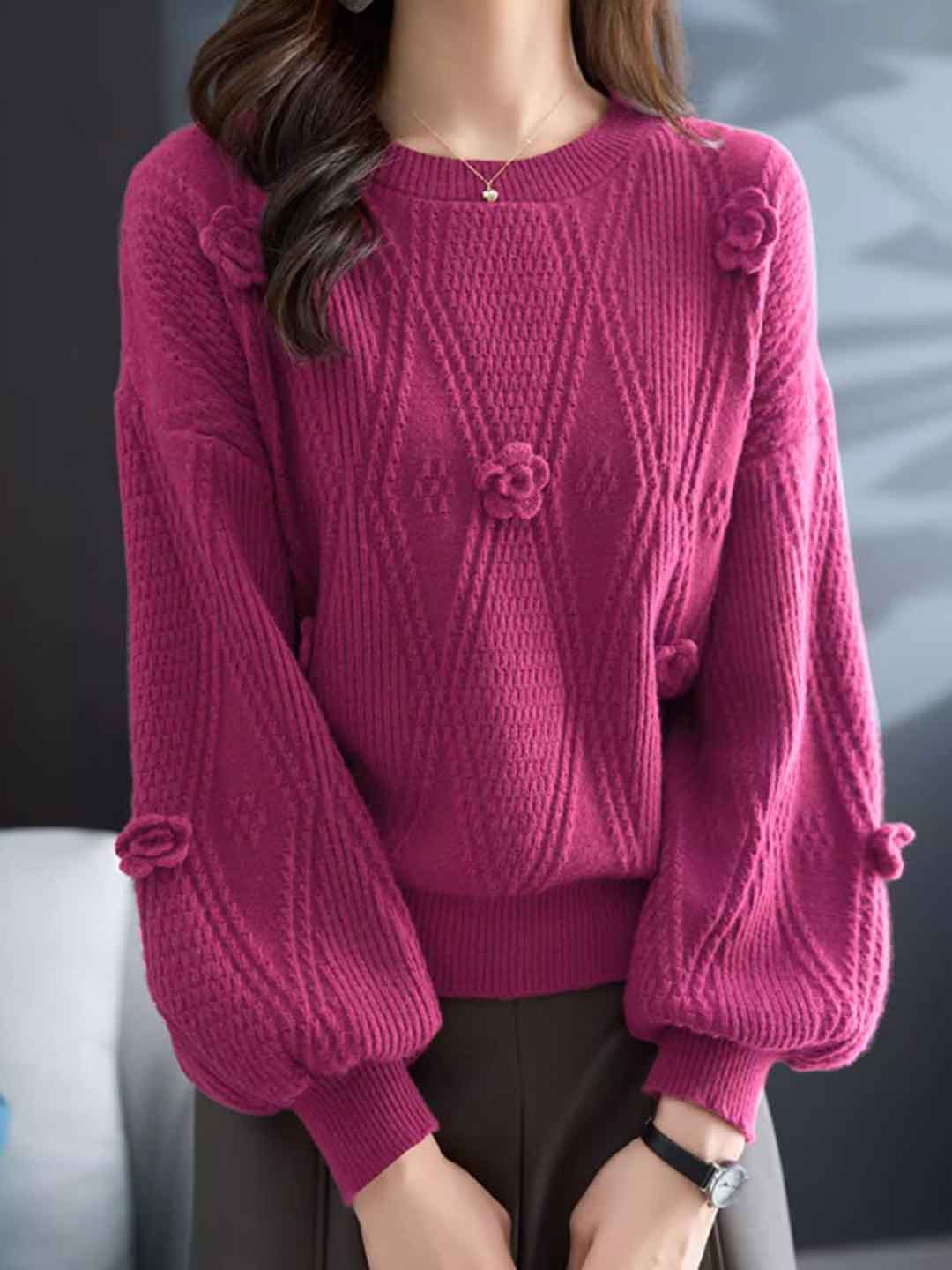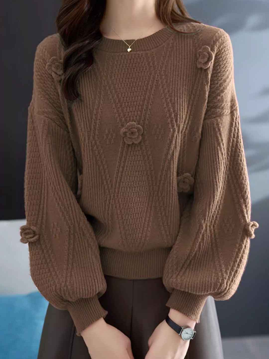 Brianna Loose Crew Neck Lantern Sleeve Floral Knitted Top