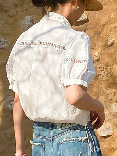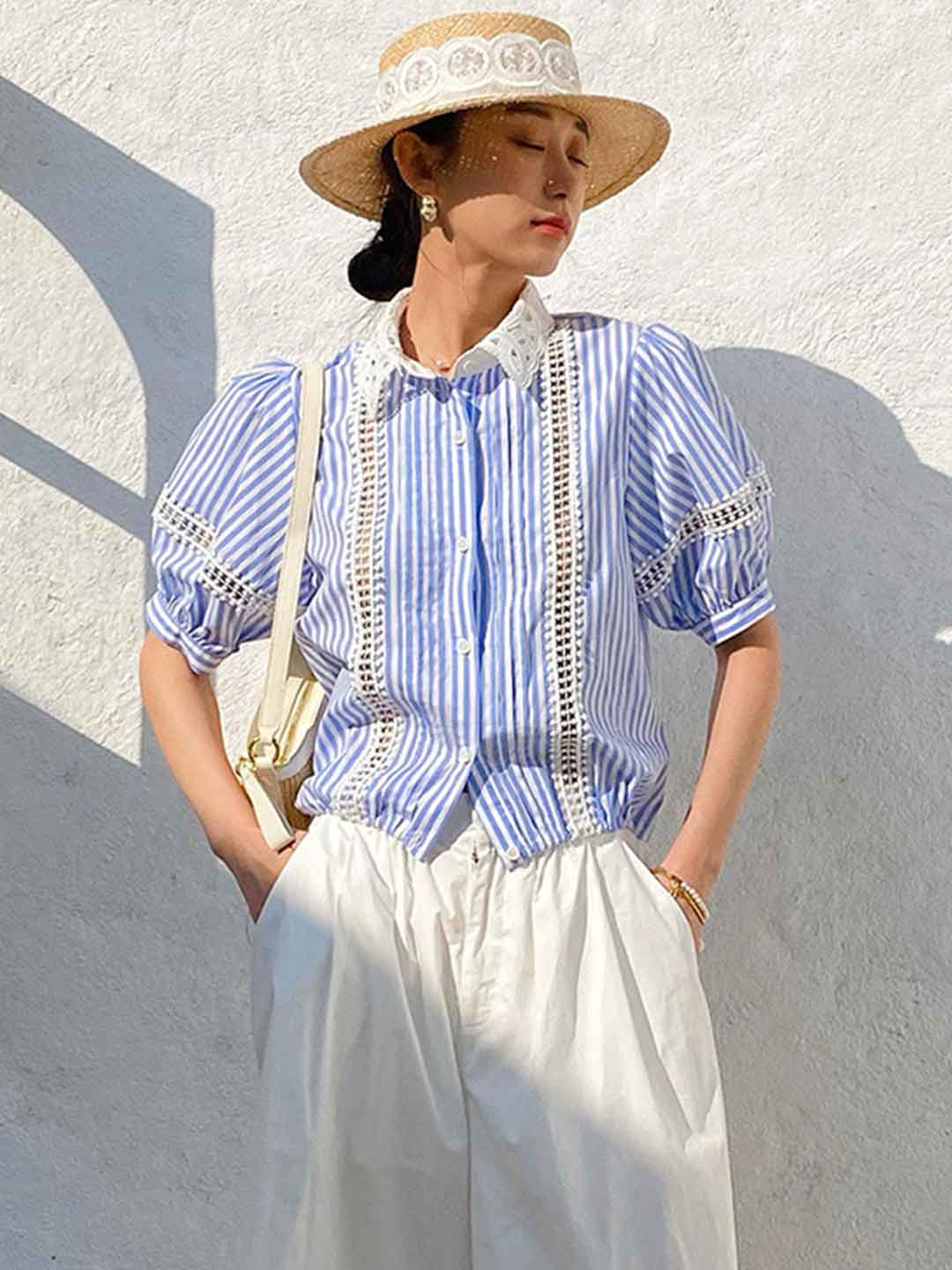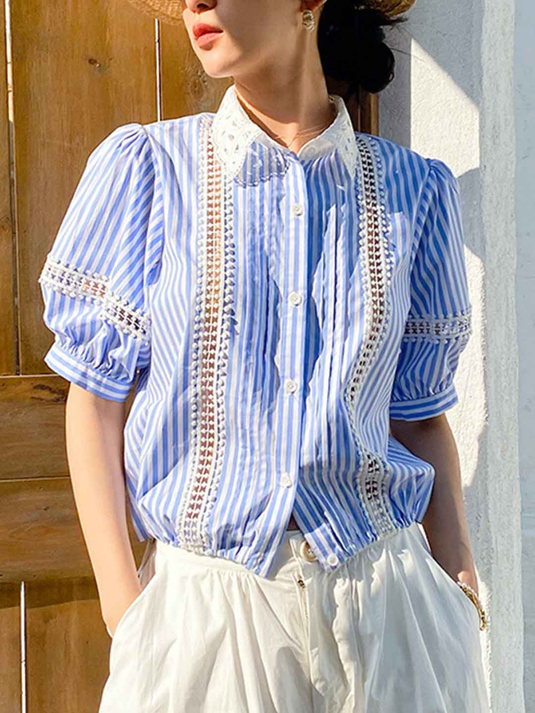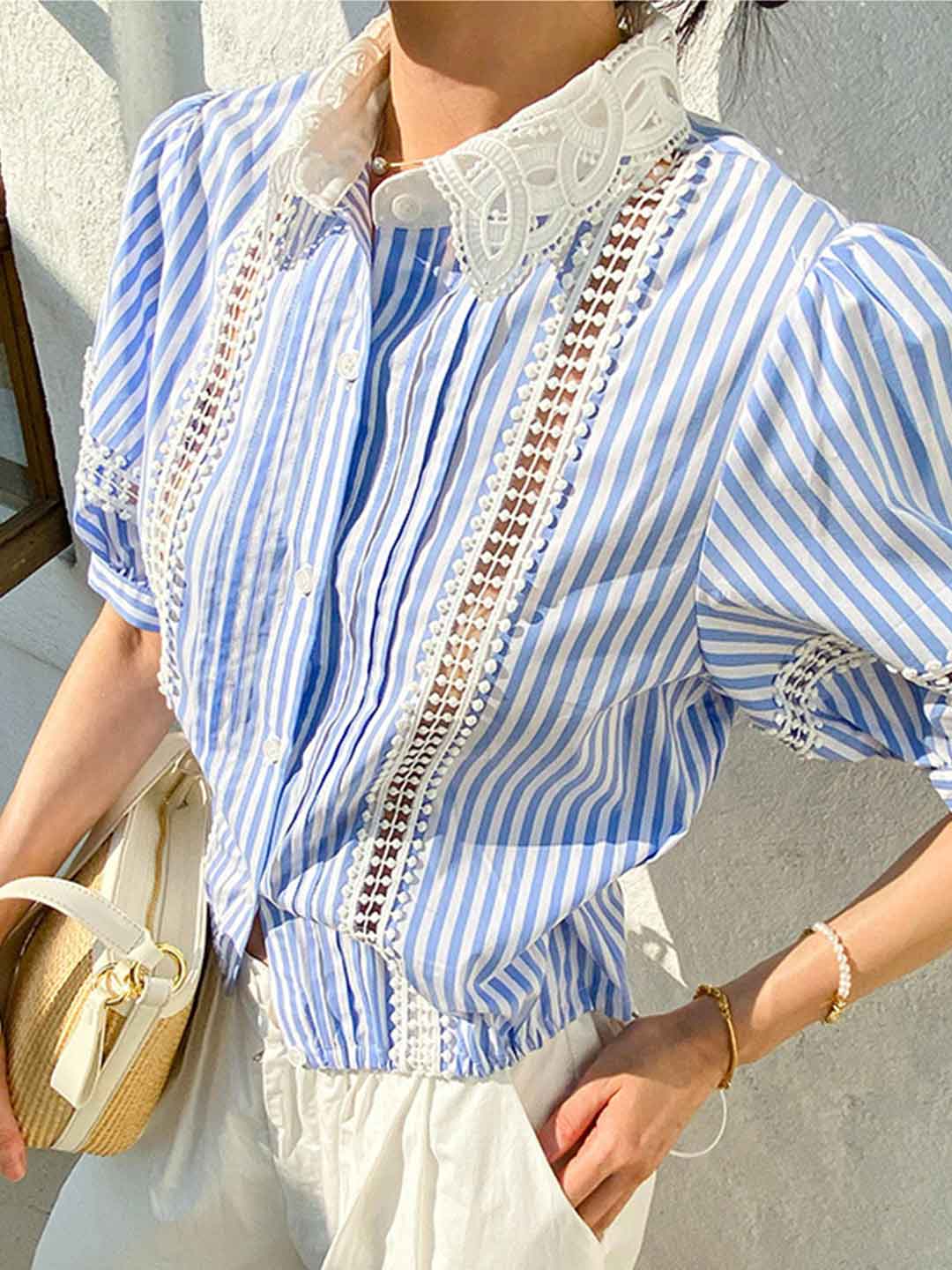 Destiny Daily Puff Sleeve Hollowed Striped Shirt