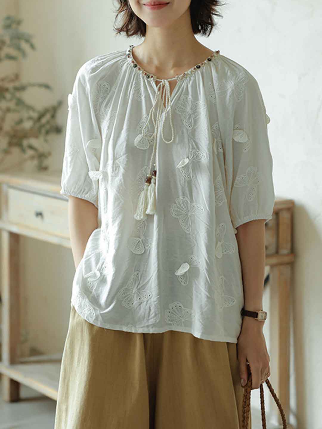 Sophie Elegant V-Neck Butterfly Embroidered Top