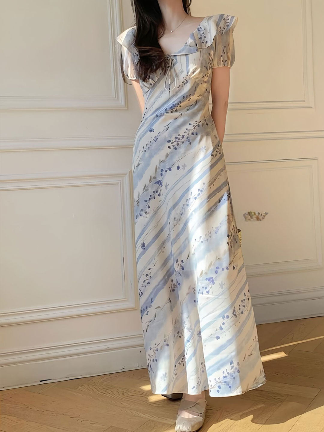 Sophie Elegant V-neck Ruffle Collar Printed Dress
